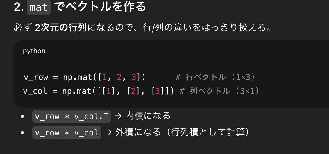 array()と同じ結果と、array()とは異なる結果が混じっている。vp2 とvp3は同じだが、vp1がvp3と同じになっている点がarray()と異なる。なるほど、これがAIの言っていた「混ぜると面倒」というやつなのであろう。直感的には、1次元リストで「ベクトル」を作りがちだ(つまり初心はそうやるだろう)。ところが、プログラミングに慣れてきたころ、途中でmat()からarray()に変えたりして、両者が混在するようなコードになると、この辺りの不一致で不具合が生じそうである。