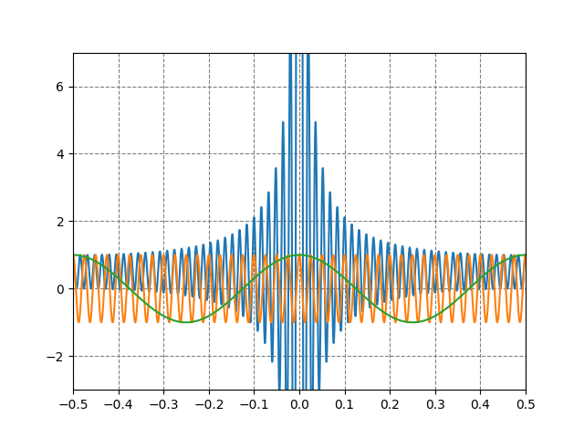 計算では${L=1}$とし、[-0.5: 0.5]の範囲でグラフを表示する。まずは${ n=62 }$までの和(フーリエ級数の有限和、あるいは部分和と呼ばれるもの)と、${n=2}$,そして${n=40}$のグラフを同時に表示させてみた。${ x\simeq 0 }$の付近でフーリエ級数は大きな値をとるため、表示範囲を${ y\le 7 }$に制限してある。